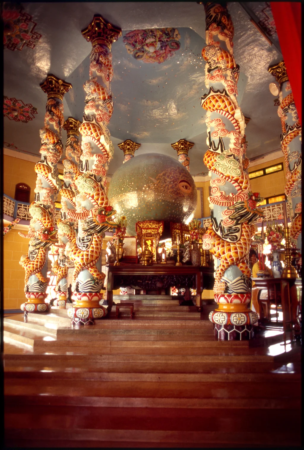 Long before reaching the Cao Dai compound smaller temples begin to appear, but none of them prepare you for the spectacle of the Gothic spires of the rainbow-coloured Holy See. It is part Disneyland, part mosque, part gingerbread castle, part cathedral; an intricately detailed confusion of styles, bizarrely impressive and bizarrely out of place in the setting of rural Vietnam. At every corner a peculiarity stands out - here a coiled serpent, there a celestial globe or the face of Christ - but throughout the building and the surrounding grounds one image is paramount: the Divine Eye. It stares out from walls, doors and gateways, reminding us that God sees all.