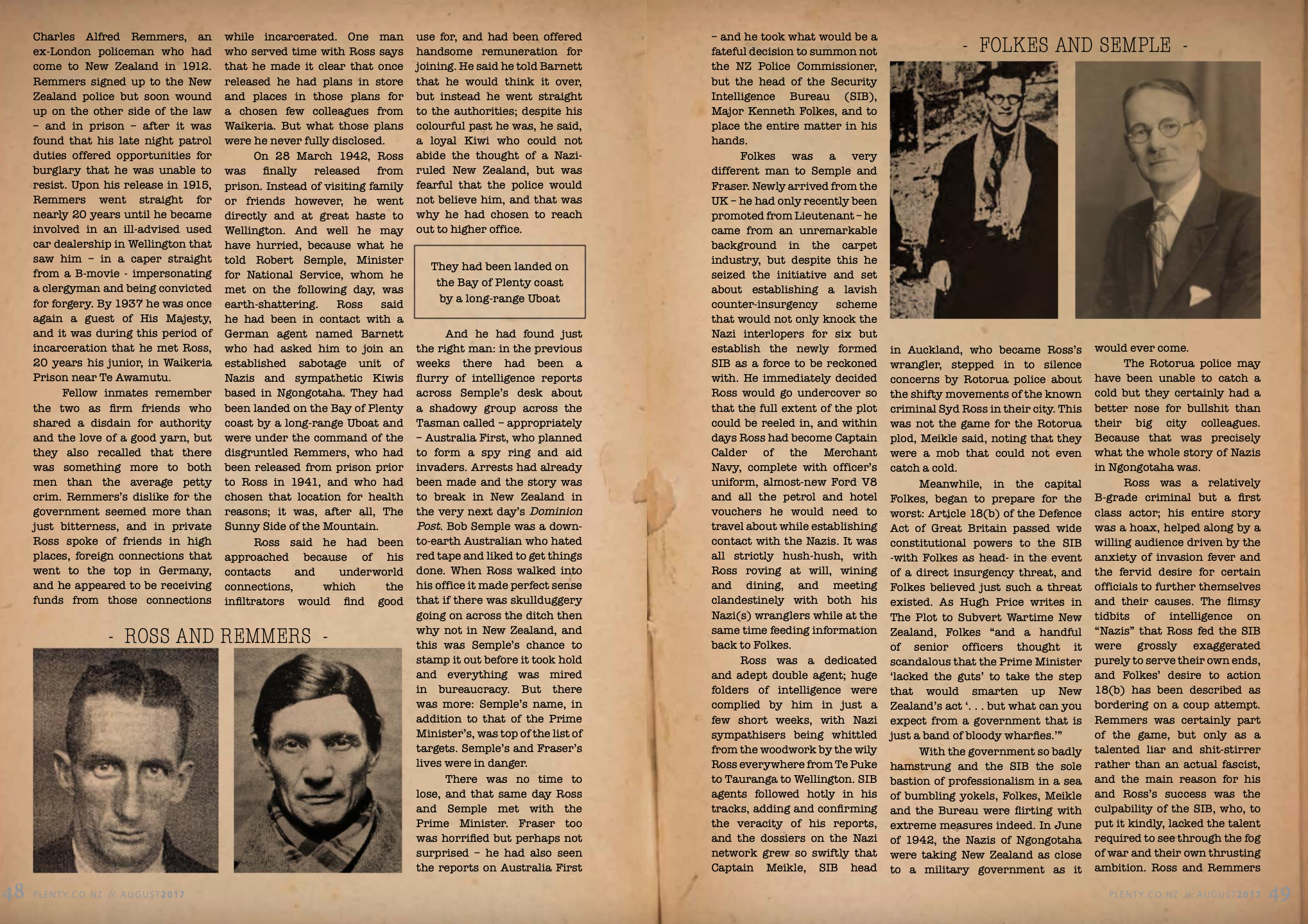 Ross was a dedicated and adept double agent; huge folders of intelligence were complied by him in just a few short weeks, with Nazi sympathisers being whittled from the woodwork by the wily Ross everywhere from Te Puke to Tauranga to Wellington. SIB agents followed hotly in his tracks, adding and confirming the veracity of his reports, and the dossiers on the Nazi network grew so swiftly that Captain Meikle, SIB head in Auckland, who became Ross’s wrangler, stepped in to silence concerns by Rotorua police about the shifty movements of the known criminal Syd Ross in their city. This was not the game for the Rotorua plod, Meikle said, noting that they were a mob that could not even catch a cold.