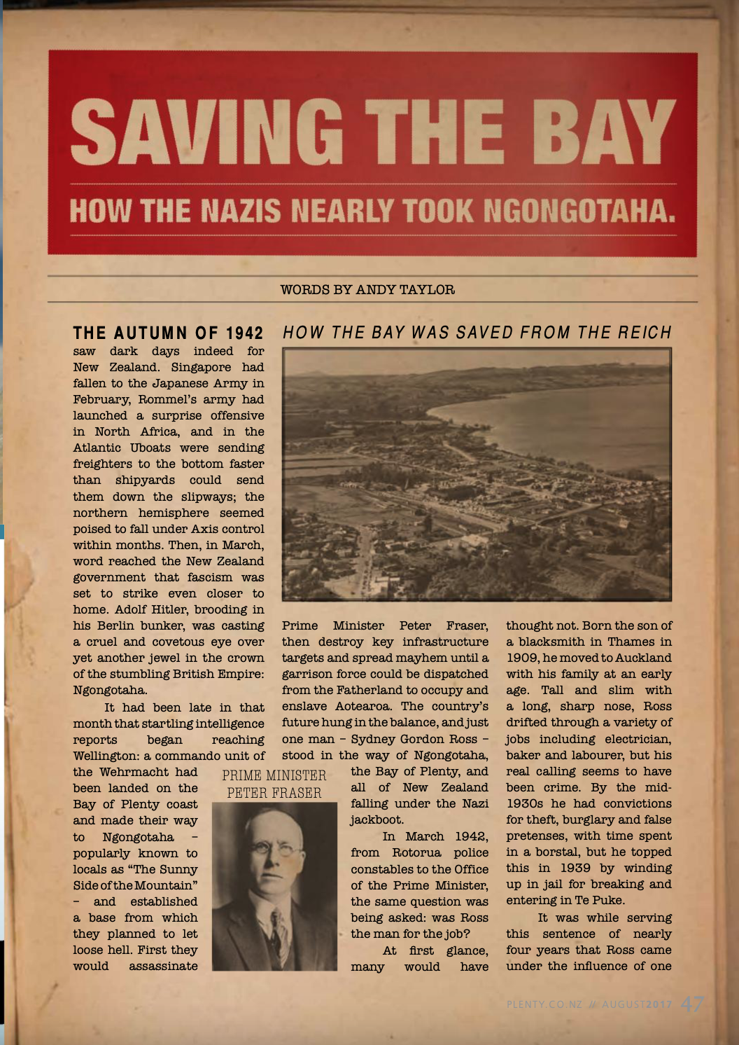 It had been late in that month that startling intelligence reports began reaching Wellington: a commando unit of the Wehrmacht had been landed on the Bay of Plenty coast and made their way to Ngongotaha – popularly known to locals as “The Sunny Side of the Mountain” – and established a base from which they planned to let loose hell. First they would assassinate Prime Minister Peter Fraser, then destroy key infrastructure targets and spread mayhem until a garrison force could be dispatched from the Fatherland to occupy and enslave Aotearoa. The country’s future hung in the balance, and just one man – Sydney Gordon Ross – stood in the way of Ngongotaha, the Bay of Plenty, and all of New Zealand falling under the Nazi jackboot. And in March 1942, from Rotorua police constables to the Office of the Prime Minister, the same question was being asked: was Ross the man for the job?